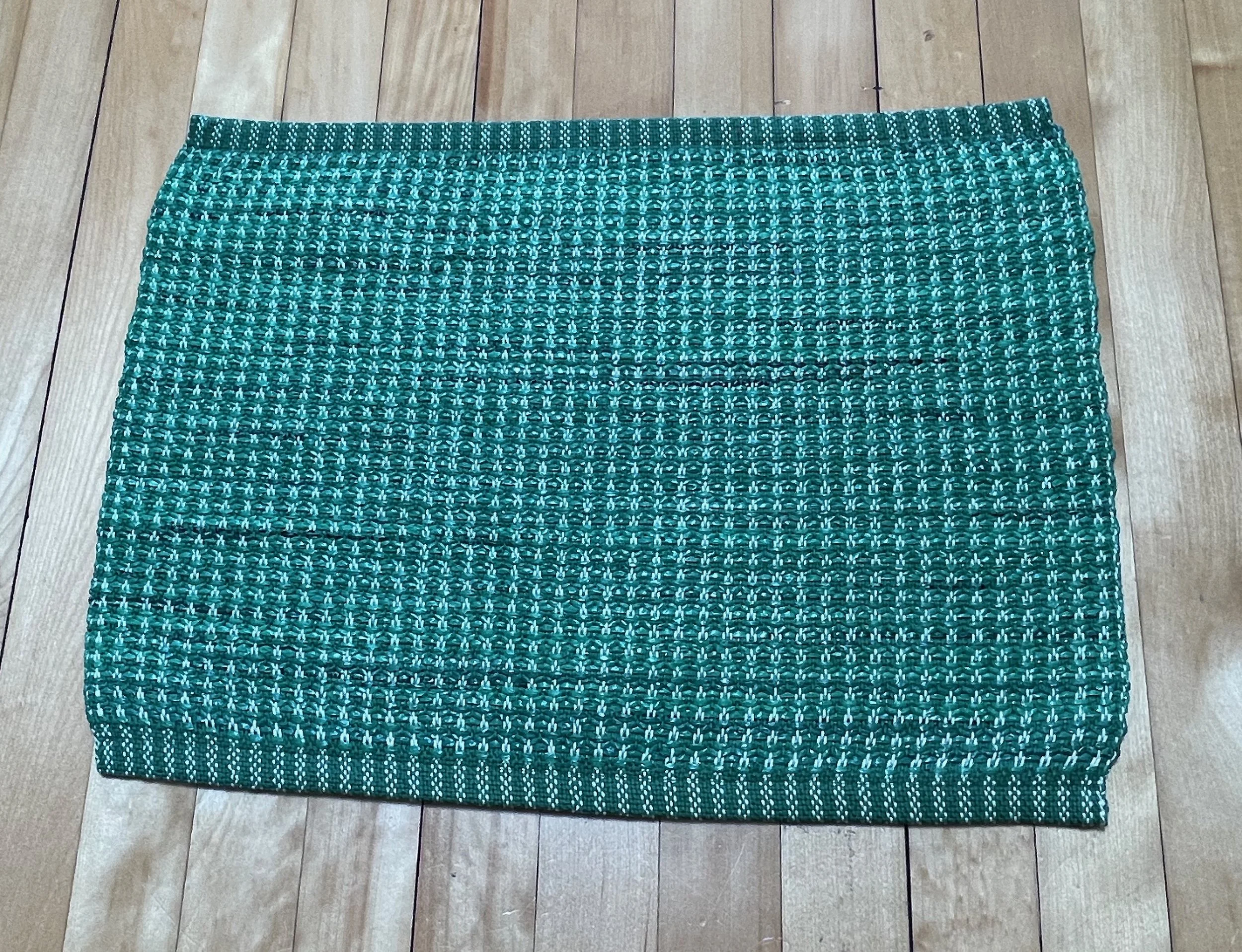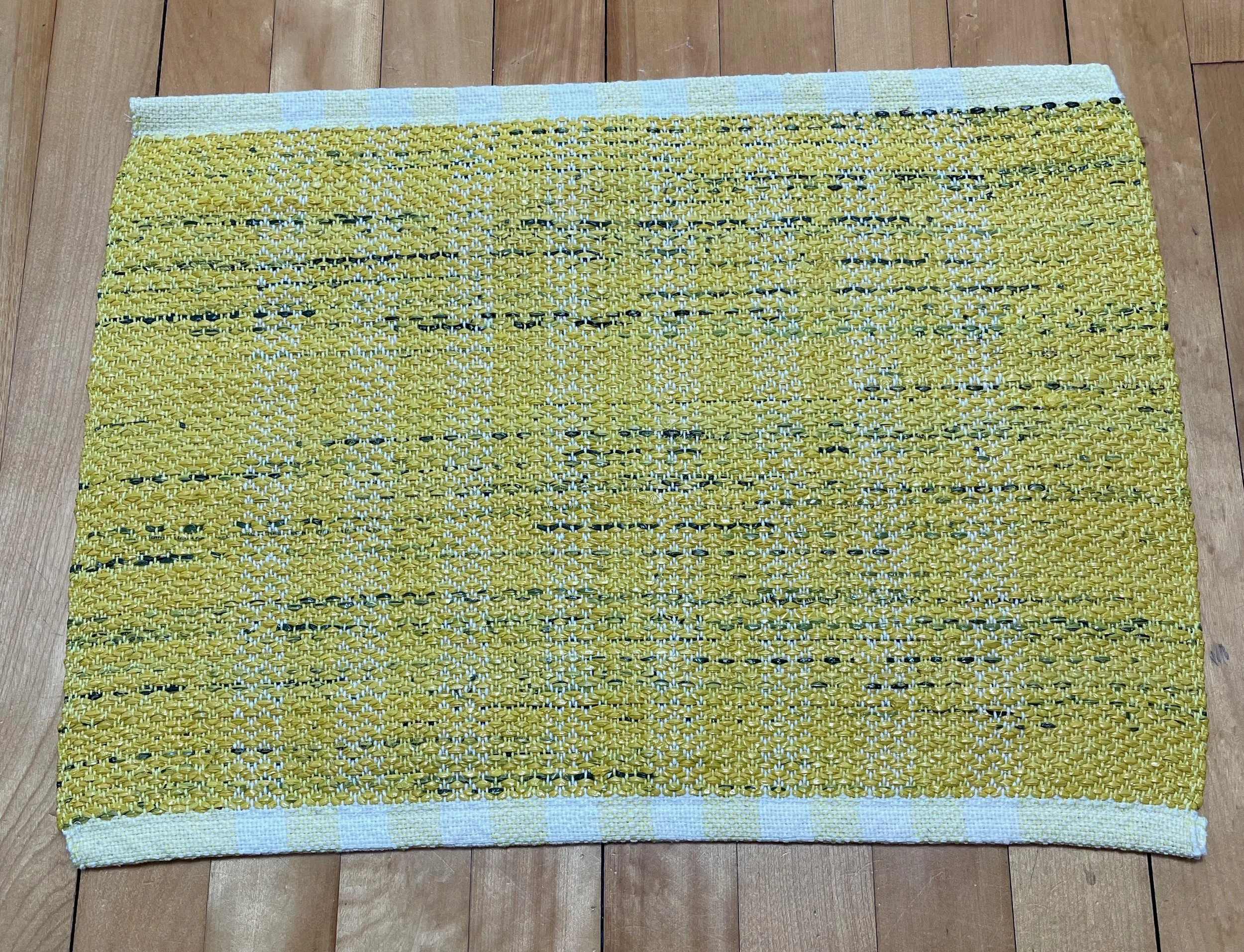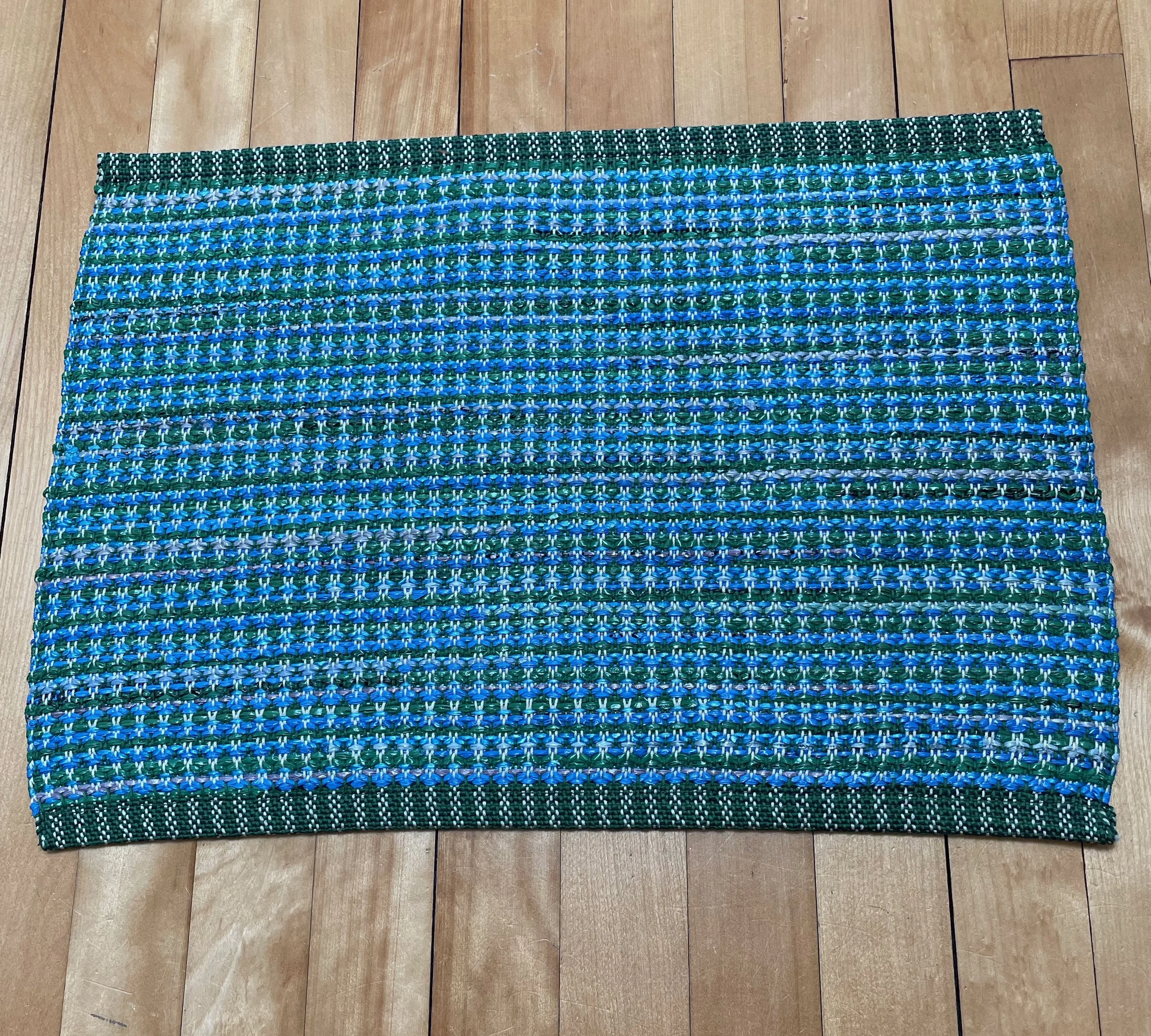 My handwoven placemats are made with 100% cotton warp and the plastic bags that come with my Star Tribune newspapers. With each placemat, I can recycle 40 plastic bags into a 20" x 15" mat. They are easy to clean and can be machine washed and dried. Steam flat with low heat and a press cloth. I will take custom orders, using the bag colors that I have in stock.